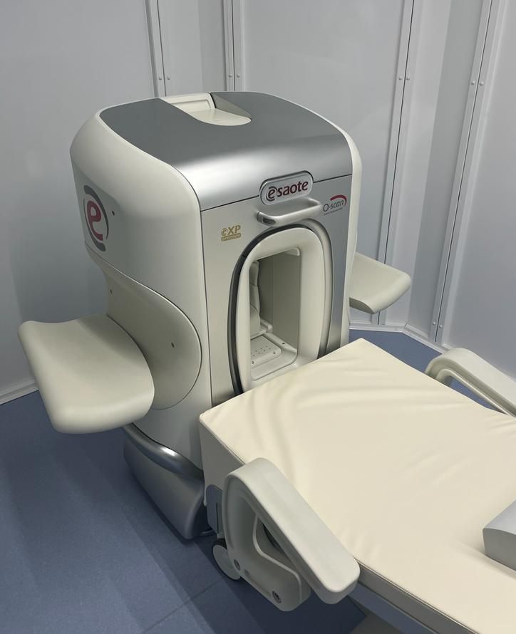 L'apparecchio per la risonanza magnetica settoriale (ESAOTE O-SCAN Premium), utilizza un magnete “aperto”, eliminando ogni sensazione di claustrofobia in quanto il paziente siede con il massimo comfort su una poltrona-lettino introducendo solo l’arto in esame all’interno del gantry.